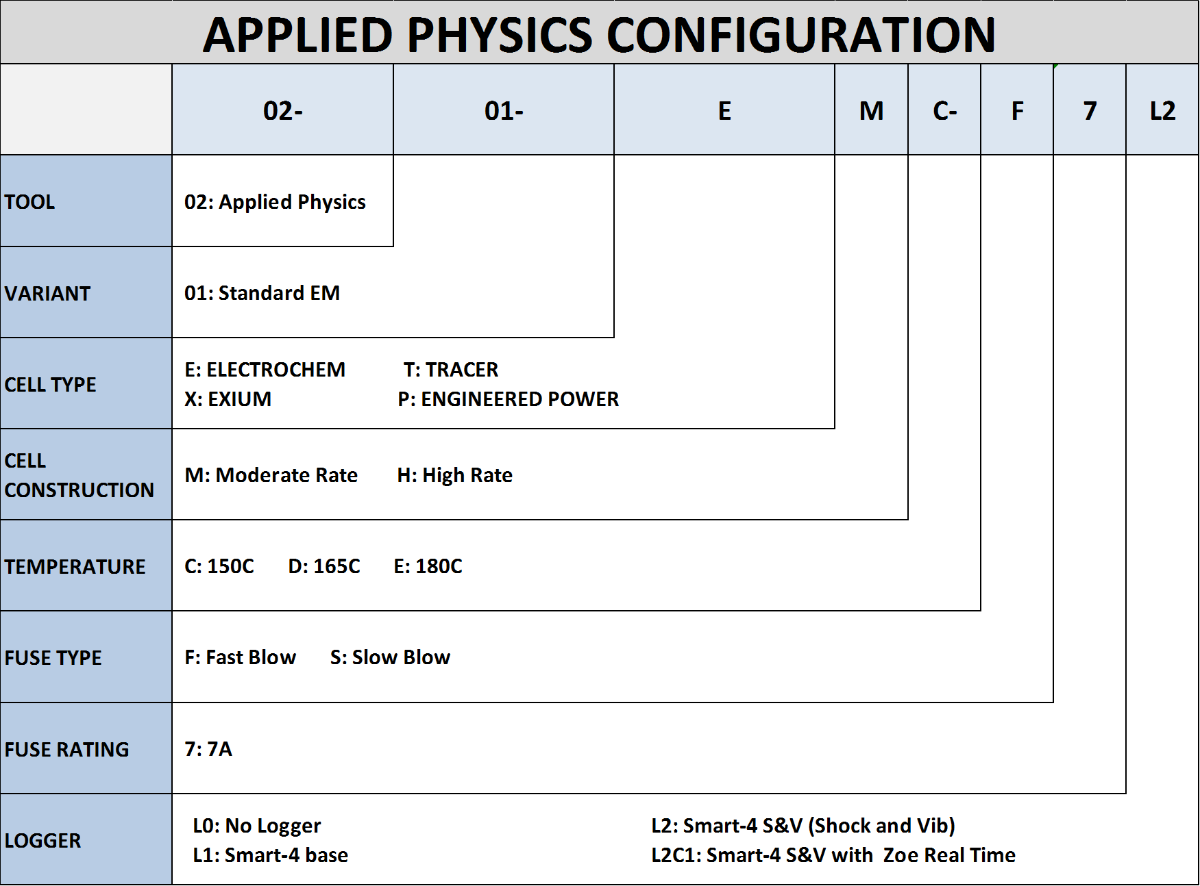 Use the following Applied Physics battery example part number to know the different configurations we offer :